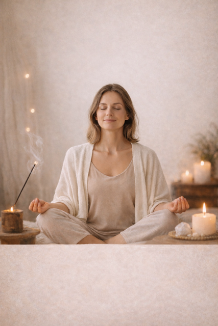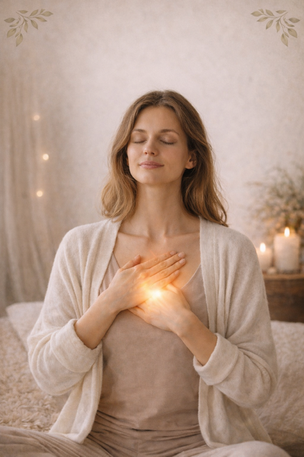 une petite musique, une bougie, un temps de respiration et de méditation guidée, ainsi que des affirmations positives pour soutenir l’intention et l’ancrage du soin.