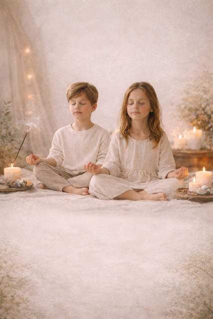 Confortablement installés, les enfants se laissent bercer par les sons des bols chantants et d’instruments doux, comme s’ils écoutaient une histoire magique racontée sans mots. Les vibrations aident le corps à se détendre, la tête à se calmer et les émotions à se poser tranquillement.